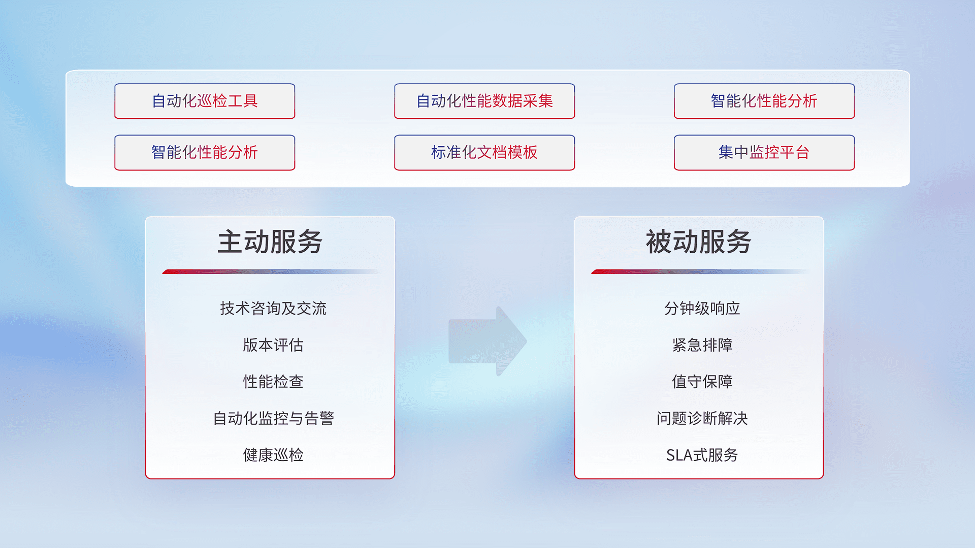 智能化工具和标准化文档,,保障服务质量,,,提供主动服务(包含技术咨询、、、版本评估、、、、性能检查、、、自动化监控与告警、、、、健康巡检)和被动服务包含(分钟级响应、、紧急排障、、值守保障、、问题诊断解决、、SLA服务)。。。。